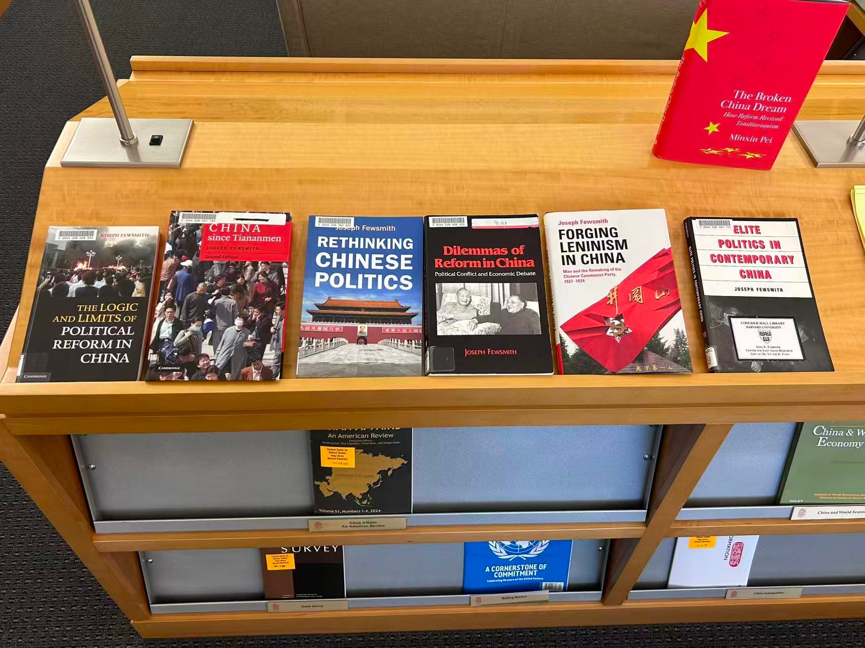 (图片说明:傅士卓教授去世后,哈佛大学的Fung Library入口处的书架上陈列了他最近的专著。)