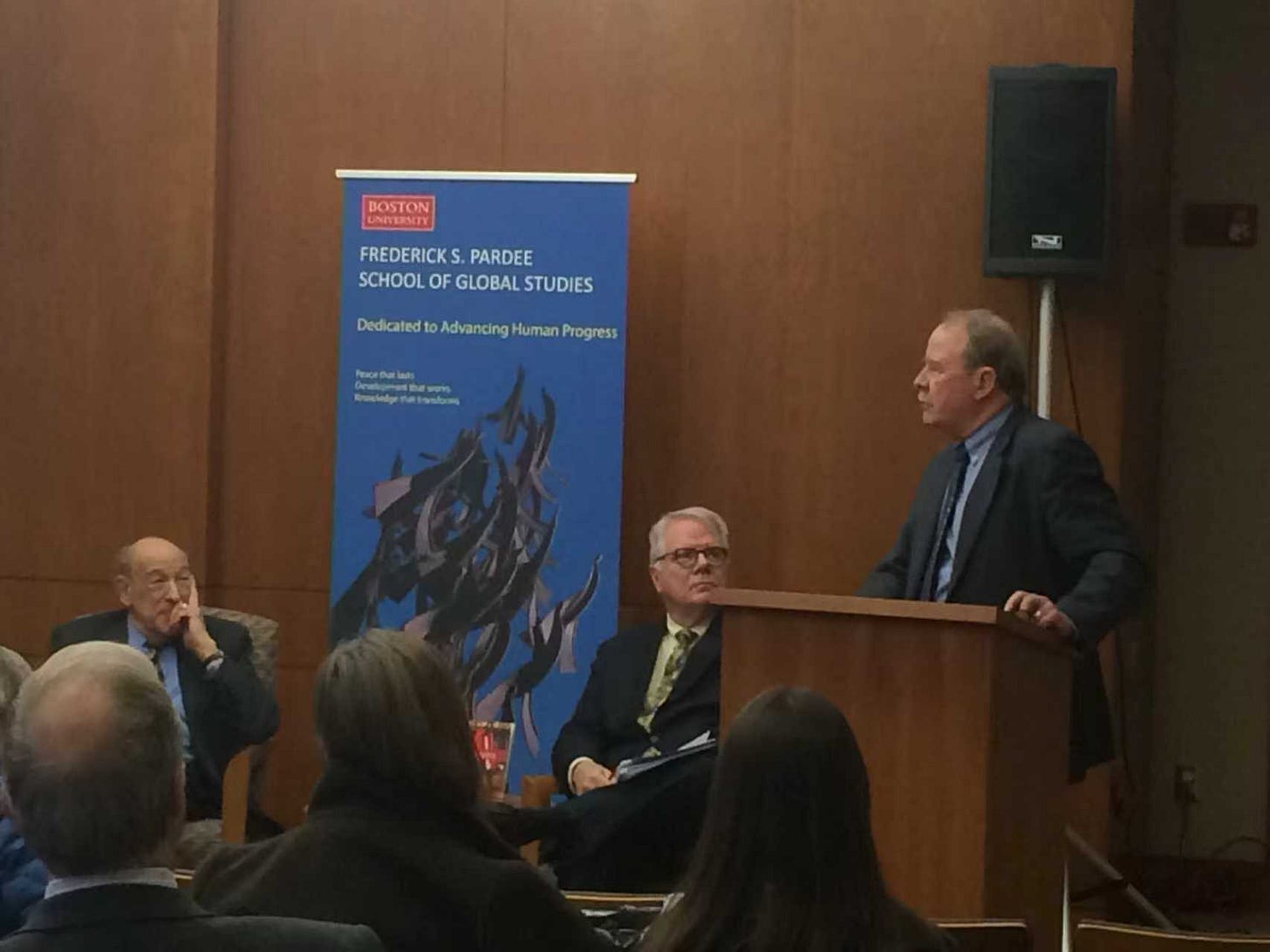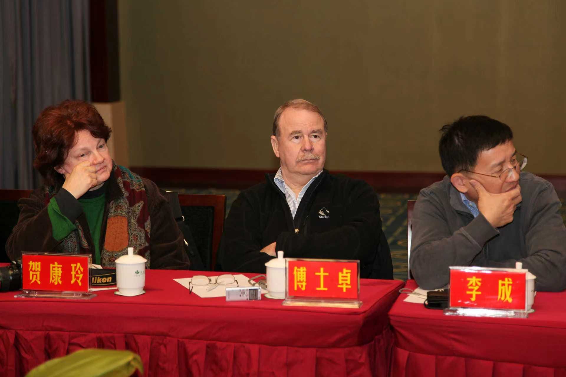 (图片说明:傅士卓教授在波士顿大学主持有关中国问题的讲座。坐在台上的分别为傅高义教授和蓝普顿教授。)