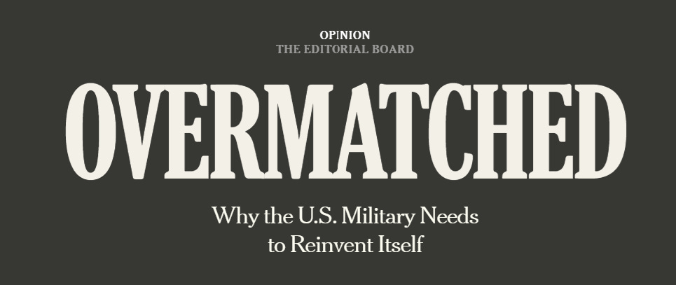 【编者按:本文是《纽约时报》编辑部的社论,2025年12月8日发表于该报,英文标题和题记是“OVERMATCHED--Why the U.S. Military Needs to Reinvent Itself”。《纽时》编辑部当时说这是关于这一话题系列社论的第一篇,但至今还没有看到其他相关社论。其次,《纽时》中文网并没有发表此文的中文翻译。第三,社论是在综述五角大楼智库净评估办公室给美国相关部门发送的简报,这个办公室已经在特朗普第二次入主白宫之后被他的国防部长海格塞斯大幅裁员。《纽时》在中美双方领导人和精英都在寻找避免发生武装冲突的护栏的时候发表这样的文章有夸大中国国防实力大大超越美国、后者必须想方设法迎头赶上之嫌,客观上是在为两国的和平共处制造障碍。点击这里下载该文英文全文。】